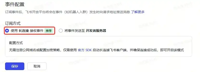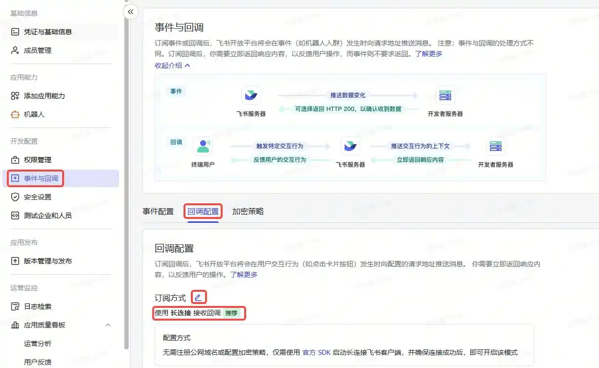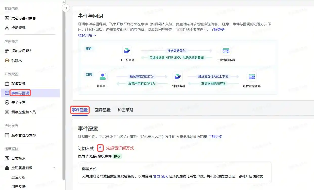 返回飞书应用管理界面,点击左侧的 事件与回调 → 事件配置 → 订阅方式。