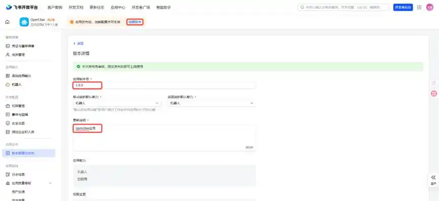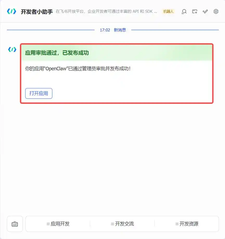完成发布后,您将在飞书中收到来自 开发者小助手 的通知。