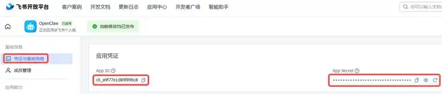 记下这两个关键信息 :点击 凭证与基础信息 ,将App ID 和App Secret记录下来,以便后续配置 OpenClaw 时使用。