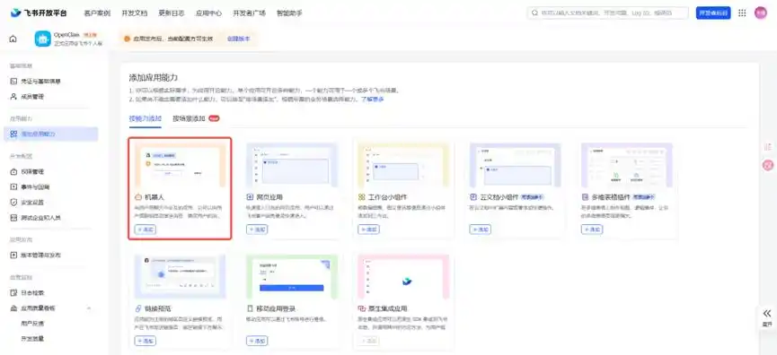 添加机器人能力 :在左侧导航栏中,找到 添加应用能力 ,选择 机器人 ,然后点击 添加。