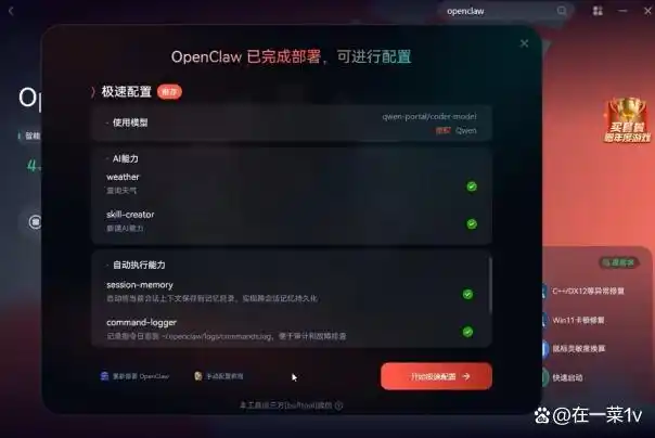 部署完成后,您将进入配置界面。在此页面,需要对千问模型进行授权。点击开始极速配置,进入授权页面后,请选择免费授权选项。