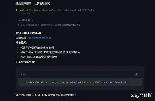 接下来,我们将安装第二个技能——检索技能:find-skills。此技能能够让小龙虾自动查询和安装解决特定问题的技能。安装方式与之前相同,只需简单指令即可,成功后如图所示:
