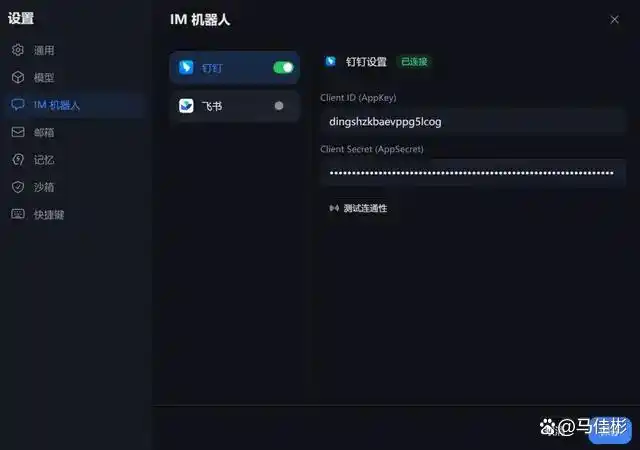 我先将这一部分补充完整,关于在国产小龙虾中接入钉钉机器人的过程基本相似,只需填写相应的 Client ID(AppKey)和 Client Secret(AppSecret)即可。