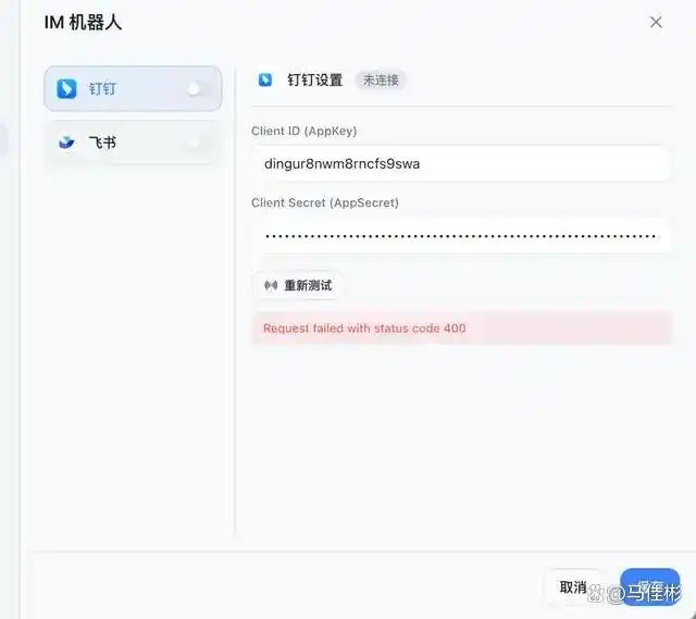 出现 400 错误的原因可能有两个:一是网络问题,二是你在钉钉开放平台的机器人配置不当。