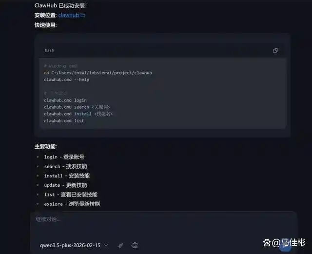 使用 Clawhub 的过程相对简单,安装成功后如图所示: