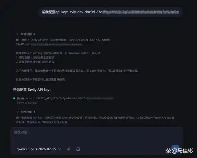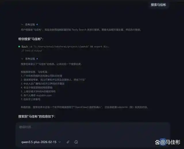 完成配置后,老马测试了一下 tavily-search 的联网搜索功能,结果显示正常,可以搜索“马佳彬”,如下图所示: