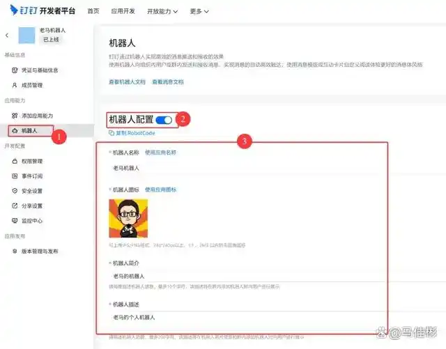 添加机器人能力后,左侧菜单会出现机器人的选项,点击进入机器人配置,记得开启机器人配置开关,并上传图标,添加机器人的简介和描述等,所有标有红星的部分都必须填写完整,如下图: