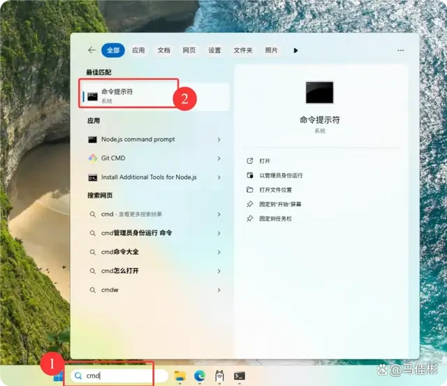根据之前老马的建议,再次搜索 CMD 并打开一个新的命令提示符窗口。当然,使用之前已经查询过版本号的窗口也可以,这样可以避免一些小伙伴搞混的情况。