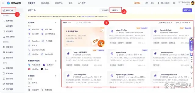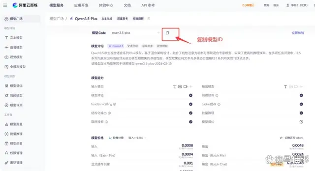 接着继续按回车,需要输入 Model ID(模型 ID),这可以理解为模型名称。返回阿里云百炼网页,在左侧菜单找到“模型广场”,切换至“前部模型”,如图所示: