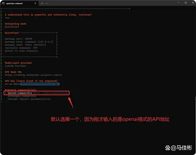 继续按回车确认,接下来选择兼容的协议端点,默认选择第一个 OpenAI 即可,因为我们之前输入的 API Base URL 地址也是基于 OpenAI 协议的,如下图: