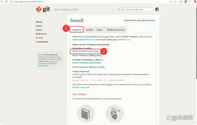 https://git-scm.com/install/windows,按照下面的截图下载适合 Windows 64 位的安装包,如图: