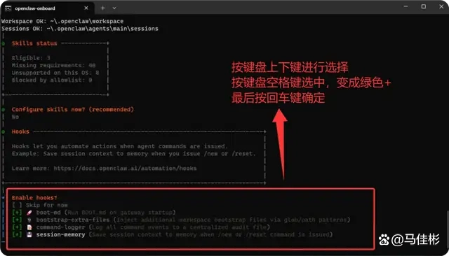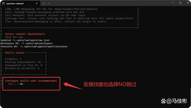 跳过后,系统将询问“Configure skills now?”即是否现在配置技能,选择 NO 并继续进行下一步,按下回车,如图所示: