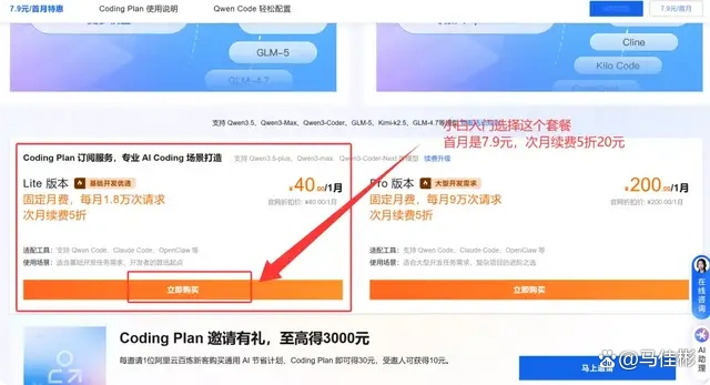 访问订阅页面后,向下滑动以找到 Coding Plan 的 Lite 版本。由于老马已经开通了该套餐,所以未显示首月 7.9 元的优惠,直接点击“立即购买”即可,如下图所示: