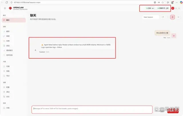如果一切顺利,你将看到自动打开的 OpenClaw 控制台网页。老马随意输入一句话,告诉小龙虾你以后称呼它为小猪,结果却出现错误提示,如下图: