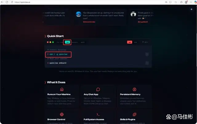接着,使用浏览器访问 OpenClaw 的官网:https://openclaw.ai,向下滚动页面,在 QuickStart 部分,点击“npm”,便可以看到安装命令,如下图: