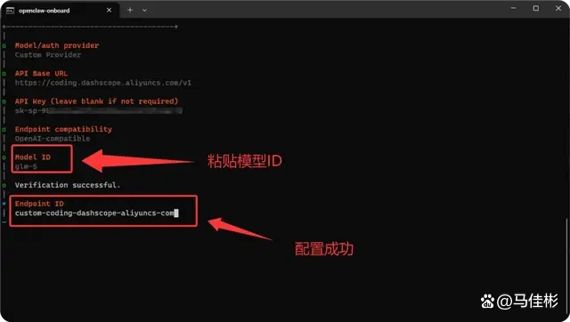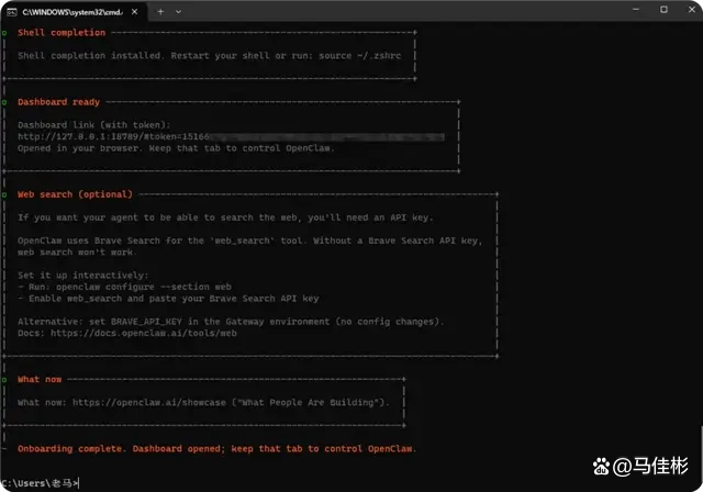 在新的命令提示符窗口中,重新输入命令:openclaw onboard –install-daemon,重启 OpenClaw 的配置向导,按照上述流程重复操作,直到验证成功,通常第二次就能顺利完成。