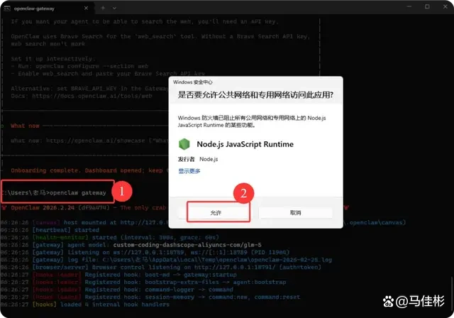 在网关启动的过程中,Windows 防火墙可能会询问是否允许 Node.js 访问公共和专用网络,请点击允许,如下图: