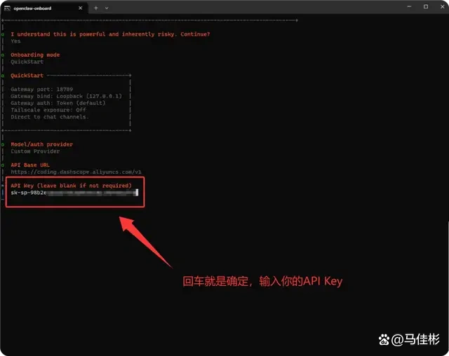 按下回车键确认后,接下来输入 API Key。回到阿里云百炼的管理界面,找到 Lite 版本套餐的专用 API Key,复制并粘贴到对应位置,如下图: