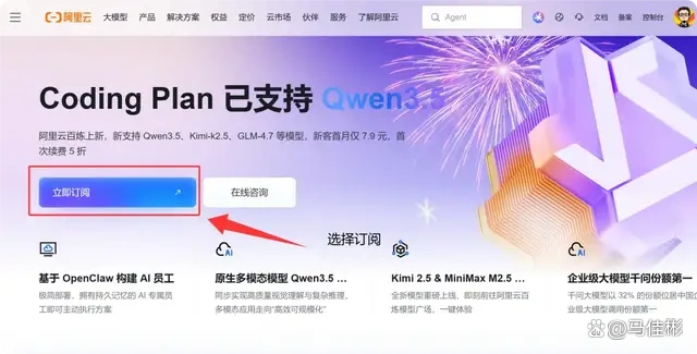 由于刚才选择了自定义模型提供商,老马此处推荐阿里云近期推出的 Coding Plan(编程计划)套餐。