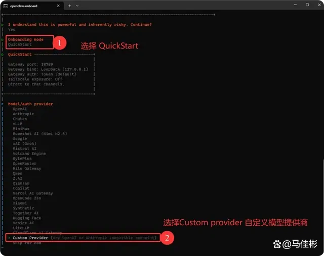 在第三步中,请使用方向键向下滚动,直到找到“Custom Provider”,然后按回车确认,这一步是选择自定义模型提供商。