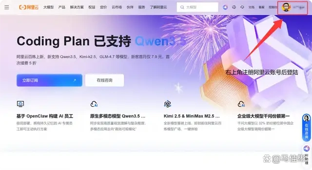 现在我们先开通这个套餐,以便后续可以将大语言模型接入 OpenClaw。首先在阿里云官网,点击右上角注册一个账号,然后登录。