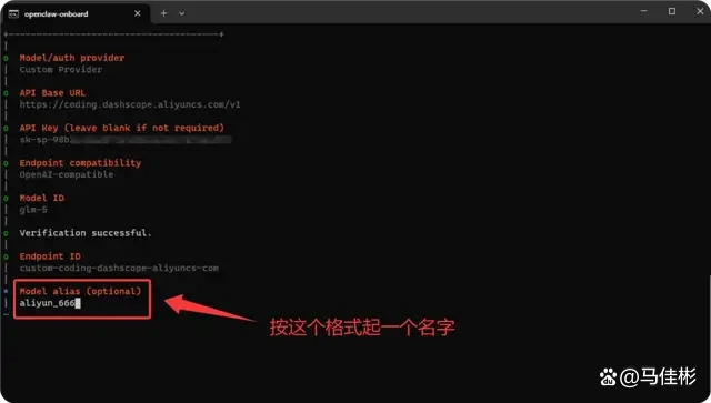 验证成功后,继续按回车,接下来需要设置一个 Mode alias(模型别名),通常格式为英文加下划线加数字,例如 aliyun_666,如下图: