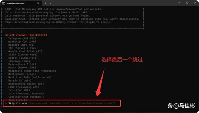 接下来,按下回车键,系统将询问是否要接入聊天工具。此时,使用键盘下箭头移动光标至最后一个“Skip for now”选项并按回车以跳过此步骤,如下图所示: