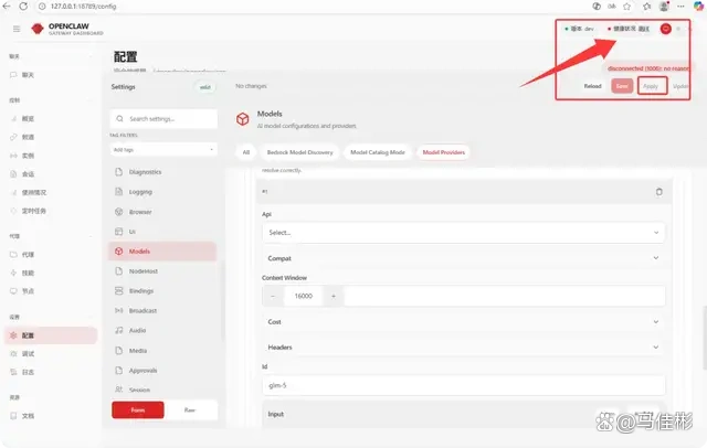 注意,老马截图中的标识标错了,点击“Save”保存不会成功,必须点击“Apply”进行提交。提交后,网关会关闭,此时在右上角你会发现小龙虾的健康状态提示为“离线”,如下图: