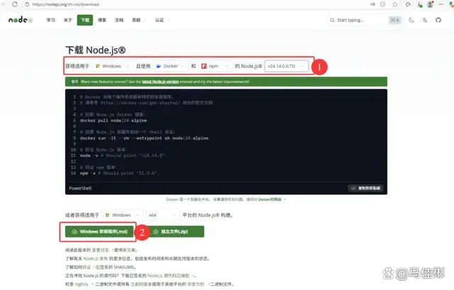 https://nodejs.org/zh-cn/download,通常会直接显示出适用于 Windows 的版本供你下载,选择版本号大于 22 的即可,如图所示: