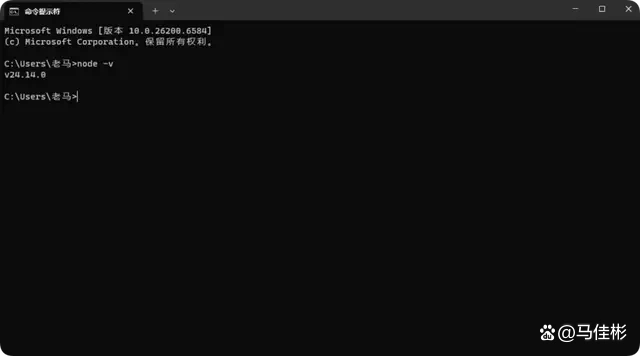 第一个命令用于验证 Node.js 是否成功安装。若安装成功,系统会显示版本号,如图所示: