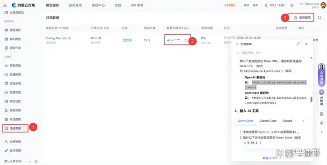 在管理界面的左侧菜单中,找到“订阅套餐”并点击,你将看到刚才开通的 Lite 版本套餐,其中包含一个专用的 API Key,右上角有使用指南的链接,可以参考一下。