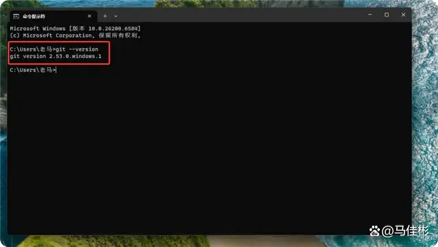 接下来,输入用于验证 Git 安装的命令。如果 Git 安装成功,同样会显示版本号,如下图所示: