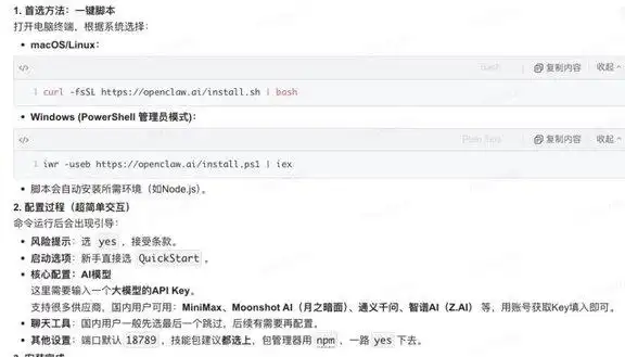 官方提供了一键部署的脚本,用户只需在终端中复制粘贴几行命令,便可轻松完成安装(详细教程会在后面介绍)。使用起来极为简便,只需通过飞书、QQ 或微信与其进行对话。