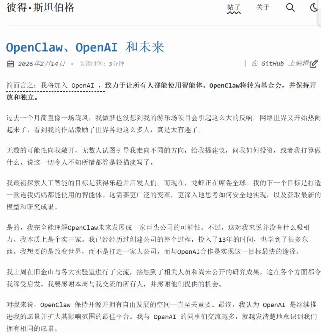 【导读】OpenClaw 创始人加盟 OpenAI中国基金报记者 泰勒 大家好,这个春节期间,人工智能领域异常活跃。2 月 16 日,备受瞩目的开源项目 OpenClaw 的创始人彼得·斯坦伯格(Peter Steinberger)正式宣布将加盟 OpenAI 公司。OpenAI 的首席执行官山姆·阿尔特曼(Sam Altman)在 X 平台上发布了相关消息,指出:“OpenClaw 将继续以开源项目的身份保留在基金会内,OpenAI 也将为其提供持续支持。”他进一步表示,斯坦伯格加入的目标是“推动下一代个人智能体的发展”。