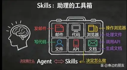 3)技能(Skills):通过工具实施操作,为代理提供实用工具。