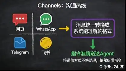 4)通道(Channels):提供操作者与助手之间的交流方式,负责消息的理解与转换。